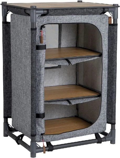 Zoals je wilt dat jouw huis en tuin er mooi uit zien, wil je waarschijnlijk ook een campingplaats die er netjes uitziet. Deze stijlvolle grijze legkast met een doek van Polyester en een grijs poedercoating frame zorgt er in ieder geval voor dat jouw kookspullen netjes zijn opgeborgen. De kast is afgewerkt met een linnen look en het oplegblad met een uitstraling van hout. Plaats een lantaarn op de kast voor sfeerlicht en alle kleine accessoires zoals een aansteker of lucifers berg je op in de zijvakken.